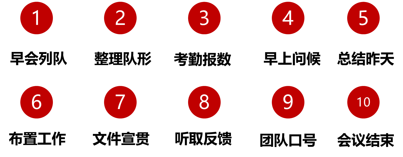 10 | 会议结束 | 1.会议结束后需要有一个指令表面会议结束。 2.团队击掌五下,结束会议(一、一、一二三)。 | 1.切记没有结束指令。 |