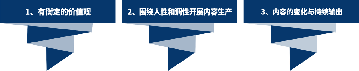 有人以为内容生产就是讲段子或蹭流量。内容生产要有价值观,三观要正。价值观隐藏在内容中,只有持续生产,用户才能识别。同时,有人认为蹭流量的话题能够获得关注,这种关注是没有积累价值的,只能强化别人。