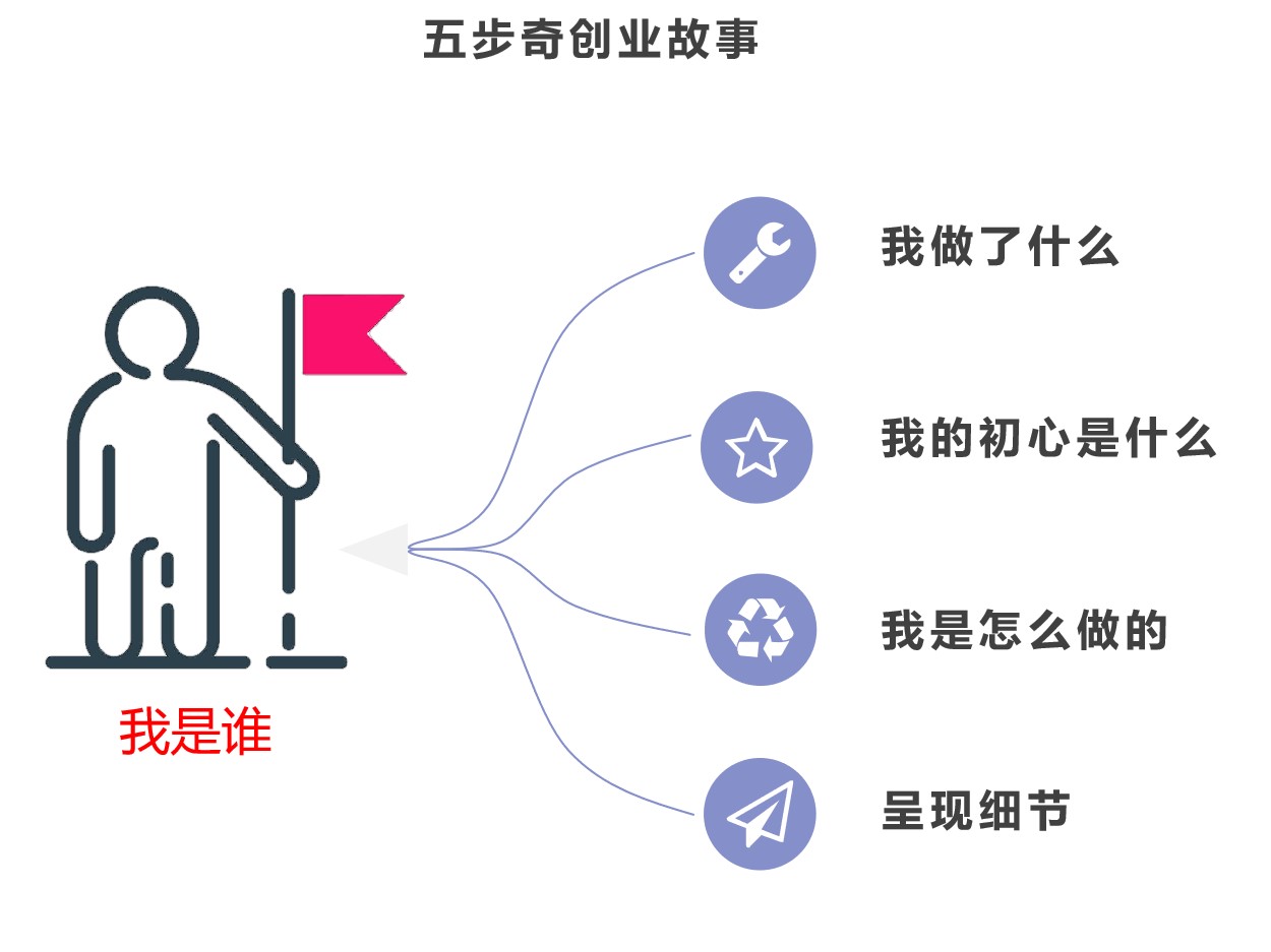 除了“超级英雄之旅”,我按照更加简单的逻辑总结了一个“平凡的人做了不平凡的事”的结构,我把它叫作“五步奇创业故事”。如图2-19所示。
