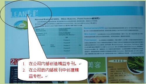 因此,非常有必要在全公司范围内广泛展开丰富多彩的精益宣传活动,将精益生产的理念和方法、精益改善的成果,尤其是员工参与的培训、研讨、改善、成果与表彰等相关活动在全公司范围内宣传和展示,使员工充分体验精益改善的氛围和文化,更好地参与精益改善并融入企业。