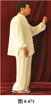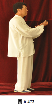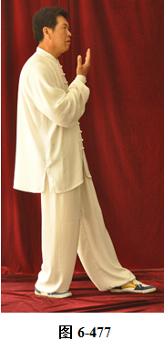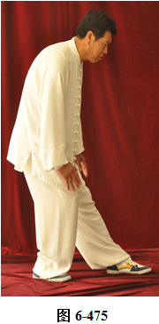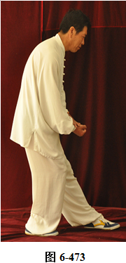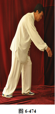 接上式,腰微拱,左右手翻转慢慢向右胯下捋,同时右脚跟落地;左腰随即左外上提,左手顺势左挒,身体随之转向面朝正东。右脚随左挒内转,脚尖朝东。右手内旋,手心朝上,左手搭在右手腕部;腰下沉,顺势两手向下打挤。同时左膝放松,左腰微提,随后微拱,左脚随腰向左前方迈出,脚掌虚着地面;右腰上提走弧形,右掌向前划圆,手掌翻转手心向下。左手随右手前送 顺势自然回放左膝外侧。身体随腰走弧线向前移动,重心前移左腿,呈左弓步, 眼神向下远视;腰回拱,重心随之移于右腿。右掌随腰回拱螺旋回收至小腹前;腰微含上提,右手慢慢翻转向上手心朝内,上抬高过头顶。腰向后转动,右手随之翻转向右外侧上方,手心朝前。左手心朝向地面,重心落在右腿上,呈后倚之式(见图6-470至6-478)。
