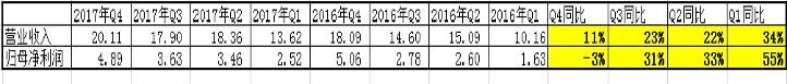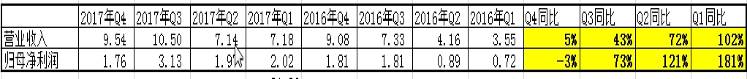 但是实际上,分季度来看,从2017年Q2开始,B公司的同比增速已经大幅下滑了。2017年Q2和Q3收入和利润增速远远低于Q1,也难怪Q4净利润增速继续下滑,乃至为负了。这跟A公司的变动趋势惊人的一致。如表1-24所示。