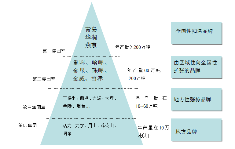 (1)市场分层明朗化。第一、第二、第三集团军凸现,市场分割形成第一个相对“均衡”的结构:全国市场主要由第一、第二、第三集团军里不足30家啤酒企业(一个集团算一个企业)唱大戏的局面,地方小企业大多在四级低利润区市场维持生存,大企业的利润导向给弱小企业及地方品牌留下生存的空间。如图1-22所示。