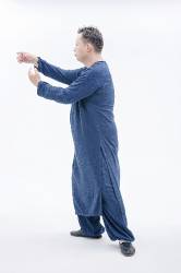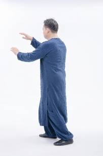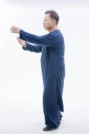 8.左脚底往下踩,带动腰胯将右脚尖向左旋与左脚成45度;左手腕再向上外侧卷出,掌心朝下。右手外形不变,由腰胯带动肩膀转正,手掌心由内向外卷出,掌心朝下,不超前于左手尾指,左手上于鼻高,右手下于胸前。此定式为第一梭。