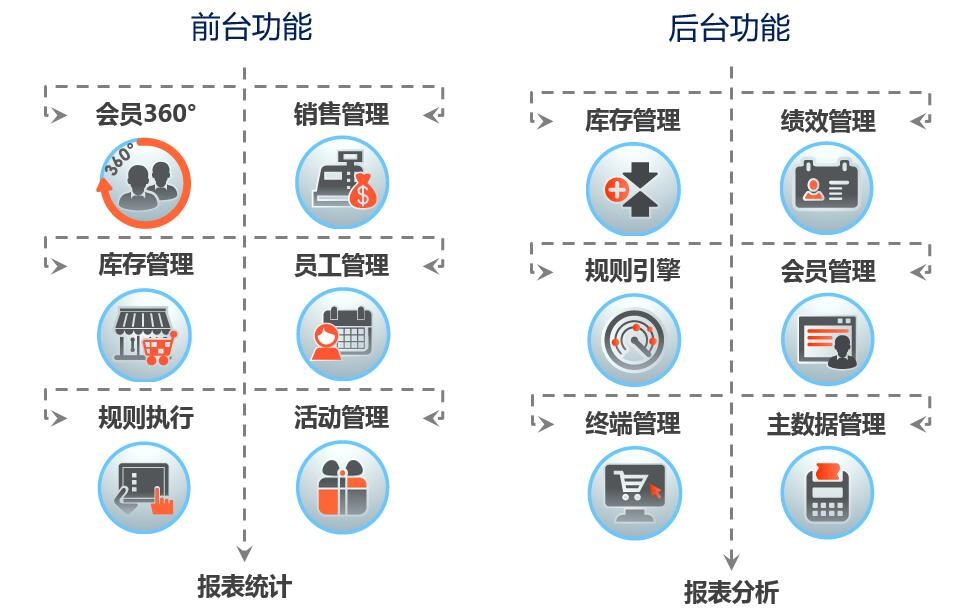 目前,改造后的欧珀莱终端零售系统核心功能分为前台功能与后台功能。前台功能包括会员360度、活动管理、销售管理等;后台功能包括库存管理、绩效管理、报表统计等。如图7-5所示。