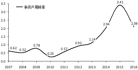 净资产周转率,反映的是企业的创收能力。乐视网净资产周转率在2015年之前持续攀升,2016年开始下滑,但幅度不大,说明它的创收能力还是很强的,但已经出现下滑态势。