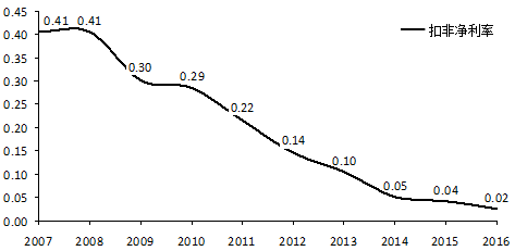 它的扣非净利率持续下滑,自2008年的0.41一路下滑到2016年的0.02。也就是说,1元的收入,它只有2分钱的利润。