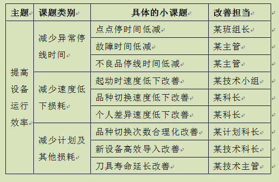 表4-17是一个大的改善课题具体落实到个人或班组的范例,从表中可以看出,只要小课题的目标能有效达到,大课题的目标也就达到了。