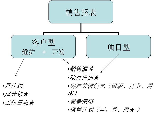 其中,项目型销售模式中最重要的两个报表是销售漏斗和周计划,这是销售报表的最低限度。特别重要的项目,需要公司资源整合和价格支持的,还可以要求填写项目评估、关键信息、竞争策略等表单。一般不需要项目型销售模式的销售人员填写日报表,因为项目不太可能天天有进展,另外对项目型的销售我们不太在意销售人员每天做什么,关键还是看销售的进展,什么时候到达下一个里程碑才是销售经理应该关心的。