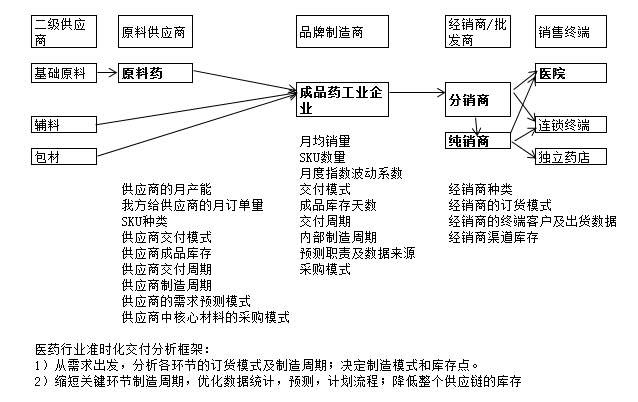 医药产业链包含医院、分销商/纯销商、成品药工业企业、原料药工业企业、辅料供应商、包材供应商等角色。医药成品药工业企业的产品分为原研药和仿制药,而国内多数企业都是仿制药的生产,同质化的产品导致了供应链的部分权力从品牌制造商转到了医院特别是三甲医院手中,同时大的分销企业如国内三大巨头国药分销,上药分销,华润医药商业也获得了很高供应链权力,因此与汽车、家电行业品牌制造企业的主导供应链需求,对分销渠道成品压货,内部均衡生产的模式不同,医药工业企业更多的是一种响应式的计划模式,它没法影响医院的订货模式,也没法影响大的分销企业的订货模式,产业链中的牛鞭效应非常严重,而医药行业对成品订单满足率的要求远远高于消费品行业,为了满足这种接近100%交付的需求,工业制造企业的成品库存的周转天数远高于汽车、家电行业。如图12-1所示。