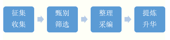 第一阶段:素材准备。首先成立编撰领导小组和相关工作人员;在原则、功能、结构、形式等方面达成共识,明确故事集定位,确定篇章架构。