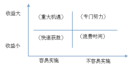 (8)形成创意。把有标记的卡片按盈利矩阵进行分类,如图2-1所示。其中,收益大,且容易实现的是我们的重大机遇,优先选择;其次选择收益小、容易实施的和效益大、不容易实施的;收益小、不容易实施的则可以放弃。