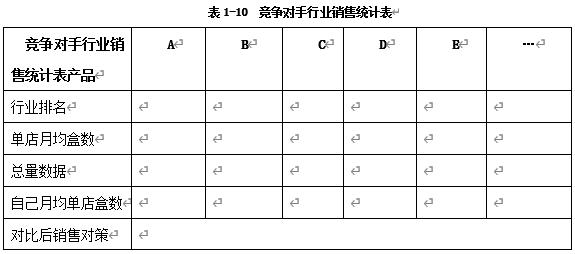 3.设计一些主要竞争对手与队友的重要参数(如产品全称、产品规格、零售价、连锁进货价、陈列位、陈列数、特色陈列、多点陈列、生产批号、是否首推、店员提成、店长提成、片区奖励、顾客促销、POP等数据),如表1-12所示。