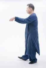 7.左脚底踩下,涌泉旋转带动腰胯将右脚尖向左旋成45度,上身朝向正西方的同时,左手夹脊略微前伸让左手看似伸垂肘长,掌心朝下,成美人手。右手吊手维持外形不变,松肩垂肘松腕,注意右肩不要因而不自觉抬起,并特别注意右脚成虚。