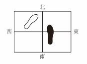 5.左脚向西南侧拉开两肩长距离,与肩同宽,两脚成90度,左脚跟点地。