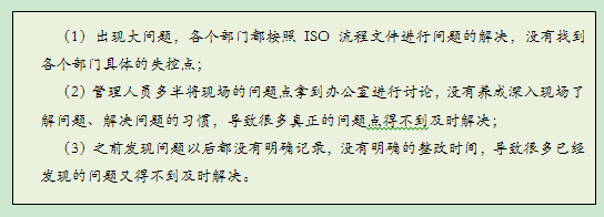 变革前的第二个问题是:管理人员多半将现场的问题点拿到办公室进行讨论,没有养成深入现场了解问题、解决问题的习惯,导致很多真正的问题点得不到及时解决。