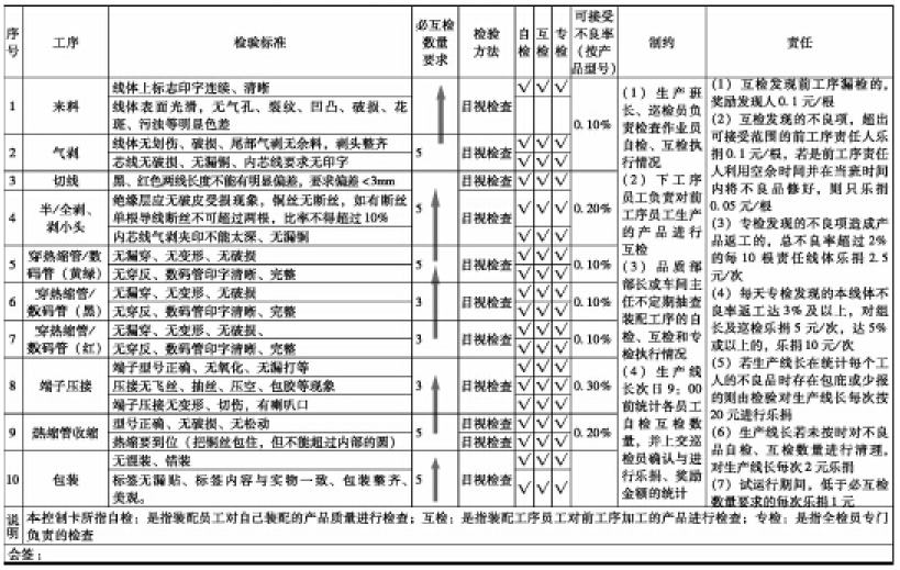 :而这些自检的项目其实就是下工序实施横向控制时的互检项目。比如气剥工序的自检内容:线体无划伤、破损、尾部气剥无余料、剥头整齐等,正是下面切线工序检验气剥工序的互检内容。每天切线工序也必须发现气剥工序5个问题。