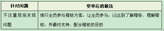 :全员参与稽核也是为了让大家在后面推行横向问责的过程中具备一个基本的稽核心态。全员参与稽核方案如下文所示。