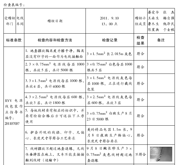2011/9/10,由稽核中心组织品质部、技术部、生产部、PMC部、人事行政部、线束车间、插头车间对电线车间的一次全面稽核,共检查51次,7次不符合,不符合率为13.72%。此次稽核对车间现场不符合项不做考核,要求车间须对不符合项限期整改。