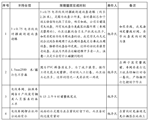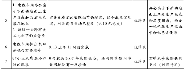 :这就要求被检查车间给我们承诺时间,承诺什么时候整改完成,谁来整改,同时把问题点的图片放到旁边,便于他自己看,自己改。