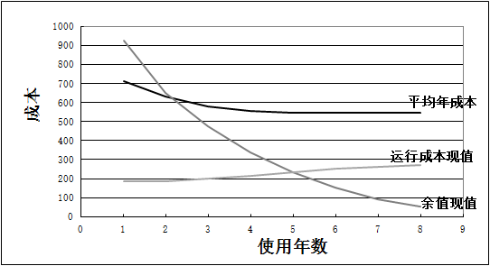 资产维度的成本不是持有成本,而是运行成本,例如航空公司的航油、航材,供电企业的工资、材料等运行维护费用。资产的持有成本是原值减折旧。随着时间递延,运行成本和持有成本呈反方向变化,两者之和呈马鞍形,必然存在一个最经济的使用年限,即固定资产经济寿命,如图2-1所示。