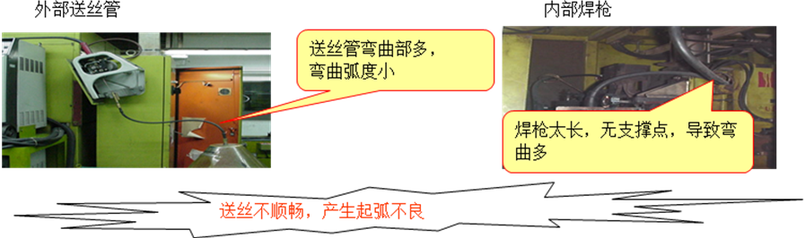 现场进行对比实验:送丝管曲处多,送丝不畅,产生起弧不良。