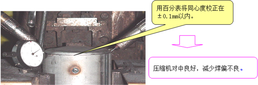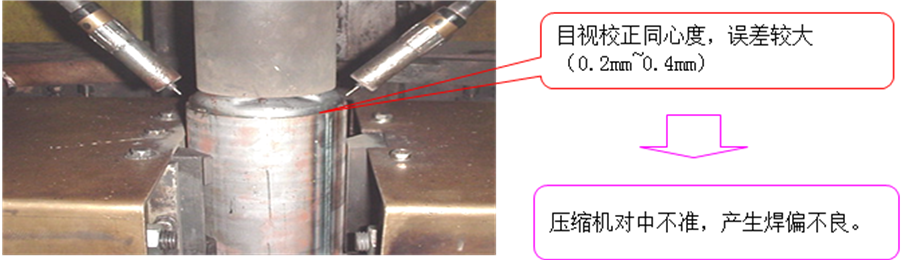 用目视与百分表校正同心度两种方法进行对比试验,目视校正误差较大,焊偏不良产生。