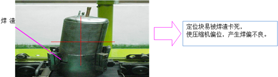 现场确认使用中的30个托盘定位块的使用情况,10个托盘定位块有被焊渣卡死现象,压缩机易被夹偏。