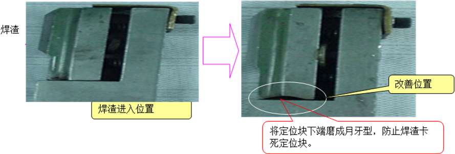 定位块形状改善:下端磨成月牙形,如图2-38所示。
