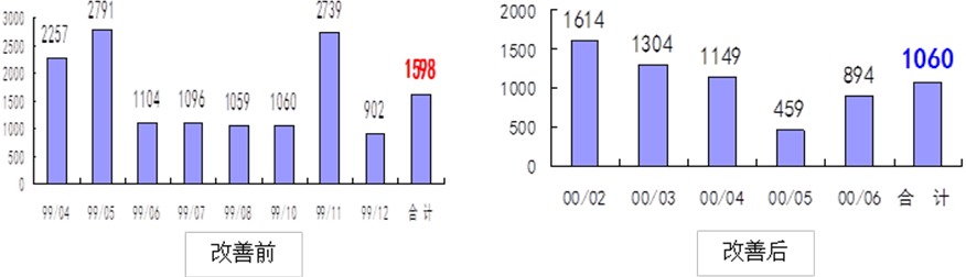 改善前后圆周焊接工序不良项目对比:改善后起弧不良、焊偏由原来的第1位、第2位降到第3位、第5位,如图2-44所示。
