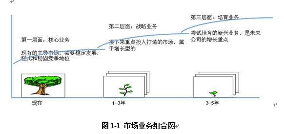 受制于企业资源的有限性,企业往往会考虑分阶段进入目标行业市场,制定一个发展计划表,逐步推进,而不是全面进入。就是我们通常说的业务组合,即:核心业务、战略业务和培育业务。其中,核心业务是现有的主导市场,需要稳定发展,强化和稳固竞争地位;战略业务是接下来重点投入打造的市场,属于增长型业务;最后是尝试培育新兴业务,是未来公司的增长重点。如图1-1所示。
