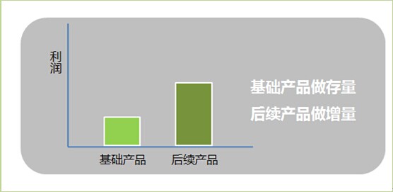 “老鼠拖木掀——大头在后边。”基础产品模型颇有点细水长流的味道。工业品企业,首先建立一个可以扩展的基础性产品架构,然后通过售后服务让客户持续购买该产品或者该产品的派生产品。电梯是基础产品,电梯维护业务是后续产品;软件系统是基础产品,系统维护和升级是增值产品;净化水系统是基础产品,而化学处理药剂则是后续产品。吉列剃须刀架,是基础产品,经常搞低价促销,意在扩大基础人群的占有率。剃须刀片和剃须泡沫,是后续产品,利润高,消费量较大。剃须刀片有排他性,无法用在其他品牌刀架上,有了刀架的鱼钩,不愁钓不到消费者长期购买的大鱼。具体如图3-4所示。