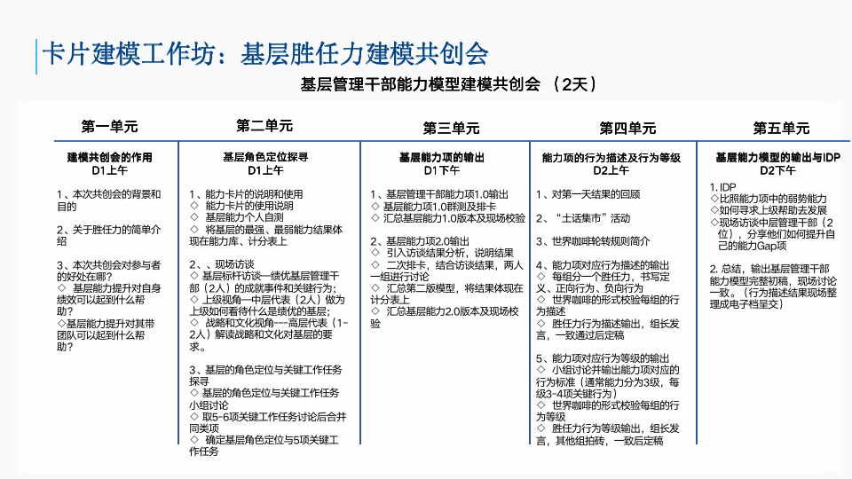我们看一下两天的共创会产出成果:一是共创出基层管理干部的胜任力能力项,如共创出5项能力项,这是第一天的成果,共完成第一单元到第三单元的所有流程;二是共创出基层5项胜任力能力项的行为描述和行为等级,这是第二天的成果,要完成第四到第五单元的流程。