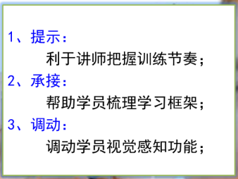 一般来说,无论什么学员都要求培训师的PPT要有逻辑、主题和观点项目,要用图文,清晰而贴切的图文效果更好,要简洁明了,这样才能调动学员的积极性,也有利于培训师运用PPT把握自己的节奏。