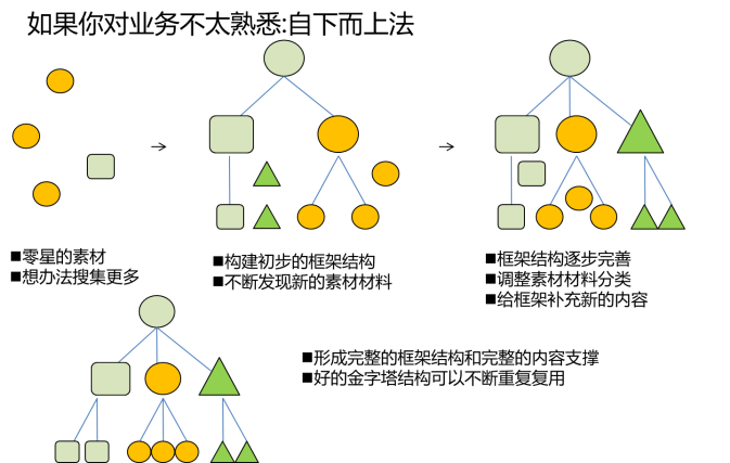 另外一种是自下而上的方式,当你对业务不熟悉,无法一次就把中心思想敲定的时候,你可以先从零星的素材入手,然后想办法收集更多的素材,构建逐步的框架结构,再去发现新的素材。在过程中逐步完善框架,调整补充材料分类,最后不断改进,完成一个课程整体的金字塔结构。具体如图10-4所示。