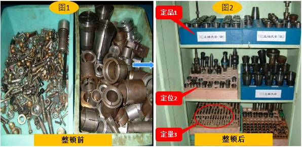 定品:标识所有物件名称,方便全员快速查找。车间的操作按钮定品标识;工具房的工具定品标识;备件室的零件、螺丝等定品标识。