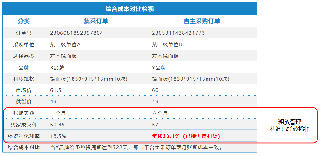 平台给予的供货价与客户自主采购的供货价均是49元,但差别在于账期天数。平台受制于资金压力,只能给予了2个月账期,平台成交价将是50.49元;而供应商为了拿下采购客户直接给予了6个月账期,给出的成交价格是57元。