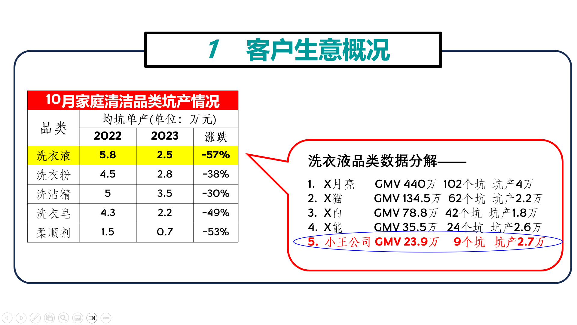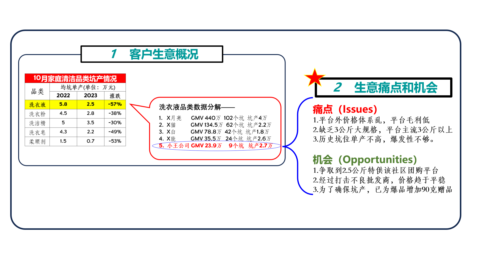 “以某个社区团购平台为例,负责洗衣液销售的小王本月的指标是在这个平台做到50万GMV,第一步需要了解这个客户的生意概况。从了解负责洗衣液的家庭清洁类目的采购基本情况开始,然后摸清楚这个品类的生意体量和趋势,以及主要竞争对手的情况。比如图5-5就是对洗衣液品类和所属家庭清洁类目的生意摸查,不仅要了解类目,还要尽可能得到主要竞争对手的销售数据和坑位单产细节。”