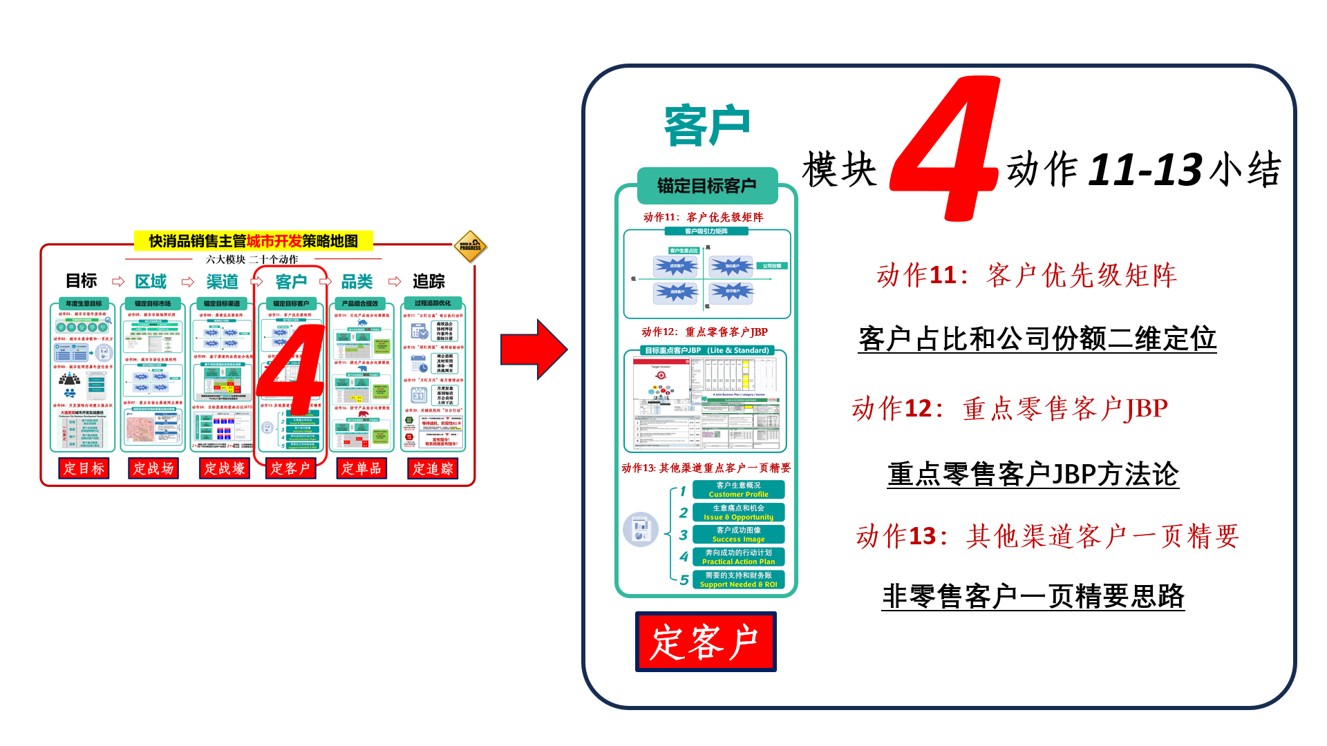 至此,“快消品销售主管城市开发策略”六大模块的第四模块——客户“定客户”相关内容的三个动作也解读完毕,我们继续跟着老王做一下小结,整体回顾一下这个模块的主要内容要点。如图5-9所示。