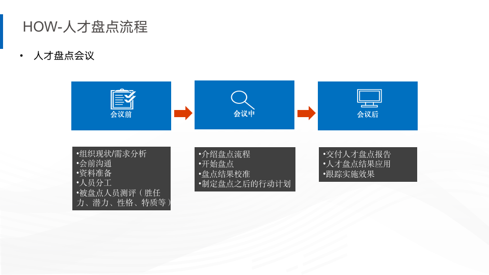 好的开始是成功的一半,而好的开始来自精心的准备。人才盘点会议前准备包括组织现状诊断、会前沟通、资料准备、人员分工及被盘点人员预测评等。而被盘点人员预测评这一步最关键,之所以称为“预测评”,则是在盘点会议前先把盘点会议中最关注的三个核心要素:绩效、胜任力、潜力预先做测评,拿到结果后在盘点会议中进行讨论与校准;还有一些企业特别关注价值观的,也会把价值观加入到核心盘点要素中。至于性格、职业动机等其他因素的预测评,就视企业的实际情况而定,很多企业并未开展。