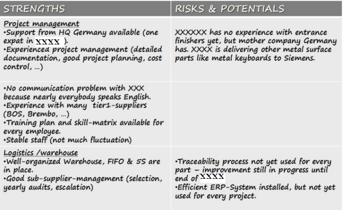 我们实际操作中一般是形成英文的报告,如表4-4就是我们曾经在走访某供应商后所制作的风险管理报告。