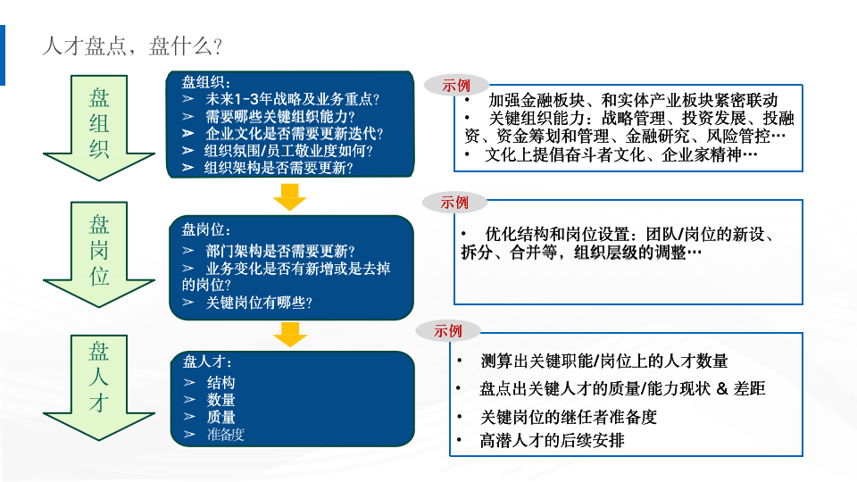 人才盘点也是人才评估体系很重要的方法,在很多公司人才盘点项目是每年人才战略的常规项目。具体盘什么呢?图3-4有对于组织、岗位、人才具体盘点内容的说明。我们重点说一下,盘人才盘什么:盘人才的结构、数量和质量,以及人才的准备度。