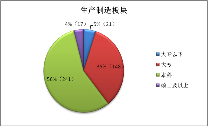 研究生、博士生等。学历结构通常可以反映出一家公司的整体人员素质水平。在一些高科技企业中,高学历人才占比会比较高,因为在人员招募时会有对候选人学历的门槛条件。我们来看一个样例,请见图3-6某企业生产制造板块的学历分布图。