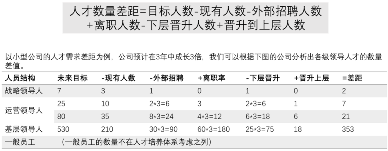 其次,盘点人才的数量。我们在盘点中也要关注人才的数量,尤其是年初盘点时,我们需要预估出当年度的人才数量,之后就会制订人才配置计划及人力成本预算。关于当年度如何计算实际人数与需求人数的人才数量差距,大家可以根据图3-8人才数量差距计算公式来测算。