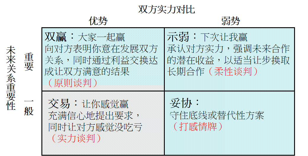 当你处于劣势,同时这个客户在与你的未来关系中非常重要。正视谈判的客观事实:卖方和买方的地位不平等,处于弱势的我方在谈判中通过“示弱”等心理战术“以柔克刚”地维护自身利益和底线。不计较一城一池的得失,这次让你赢下次让我赢,着眼于未来合作的潜在收益,以适当让步换取长期合作。