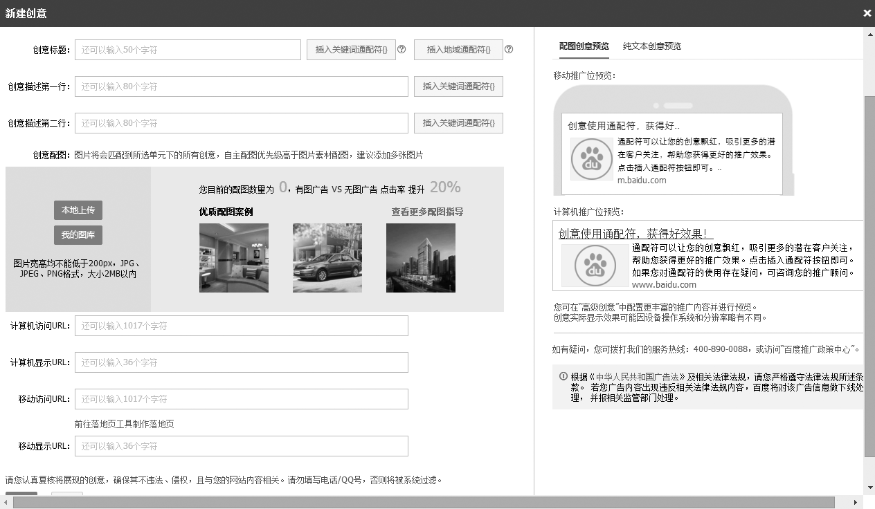设置好关键词,接下来就是编辑广告创意,这是一项对人要求比较高的工作,一般都是由网络营销团队的文案来担当。但真正的广告创意高手是一个全才,一要熟悉企业的产品与服务;二要了解行业、竞争对手,能写出差异化文案;三要有好的文字功底,因为百度的广告区域有限,一字千金;四要熟悉搜索推广账户的各种游戏规则,也就是说是一个SEM高手;五要有一定的平面设计功底,此人需要制作广告图;六要有广告法和商标法的意识,不能违法,否则哪天稀里糊涂地因触犯哪条法规,不但账户会白白关掉,还有可能受到重罚。