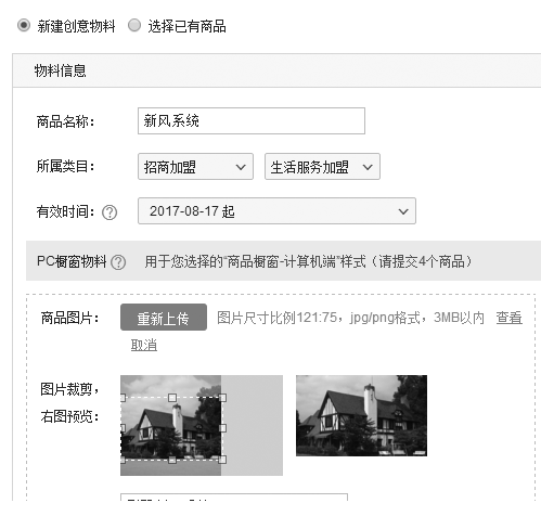 选择好样式后,接下来就是建立创意物料,如图3-45所示。为产品设置名称、分类和有效时间,并上传产品图。