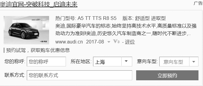 【自定义表单组件】:通过在广告中增加自定义表单的方式,收集用户信息和需求,形成销售线索。让广告主能与这些最有价值的客户直接沟通,也让客户得到一对一的实时服务,直接促进成单。(注:这就是刚才看到的奥迪车广告中客户留言框。)