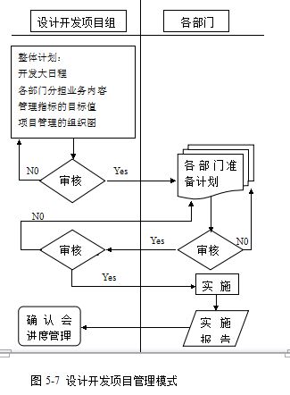 图5-7模式就是由项目组经理负责制定整体计划。整体计划包括设计开发大日程,即什么时间进行试做及试做多少台,试做每台的目的与用途,什么时间正式批量生产等。整体计划还包括新产品开发准备过程中各部门需要完成的业务内容(如表5-5),新产品开发准备过程中各项管理指标的目标值(如表5-1)。整体计划也包括设计开发项目管理的组织图,在设计开发项目组成立前,由公司要求各部门选定开发准备过程中自己部门的派遣成员。当然,在本章开始提到的“企划阶段决定的主要内容”,作为附件告知相关人员(注意,什么样资料传达到什么级别,公司应在资料上明确标注,以便保密)。各部门选定的参加设计开发项目组的成员,根据整体计划要求,代表本部门制定所在部门在新产品准备过程中实施的详细计划,再经过本部门经理审核后,提交项目开发组在协调会上进行协调沟通与审核。例如: