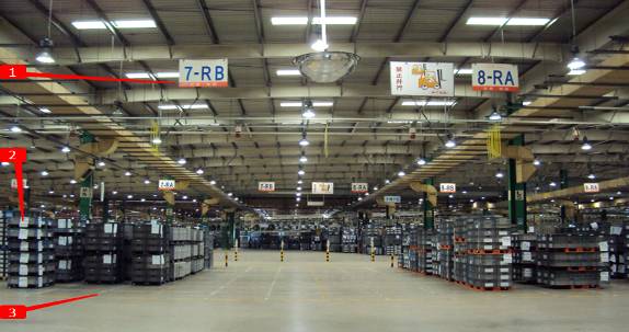 箭头1:货位区域明确标识,让员工知道具体位置,放的人知道放在哪里,取的人知道去哪里拿。时间是不是缩短了?成品生产周期是不是提高了?